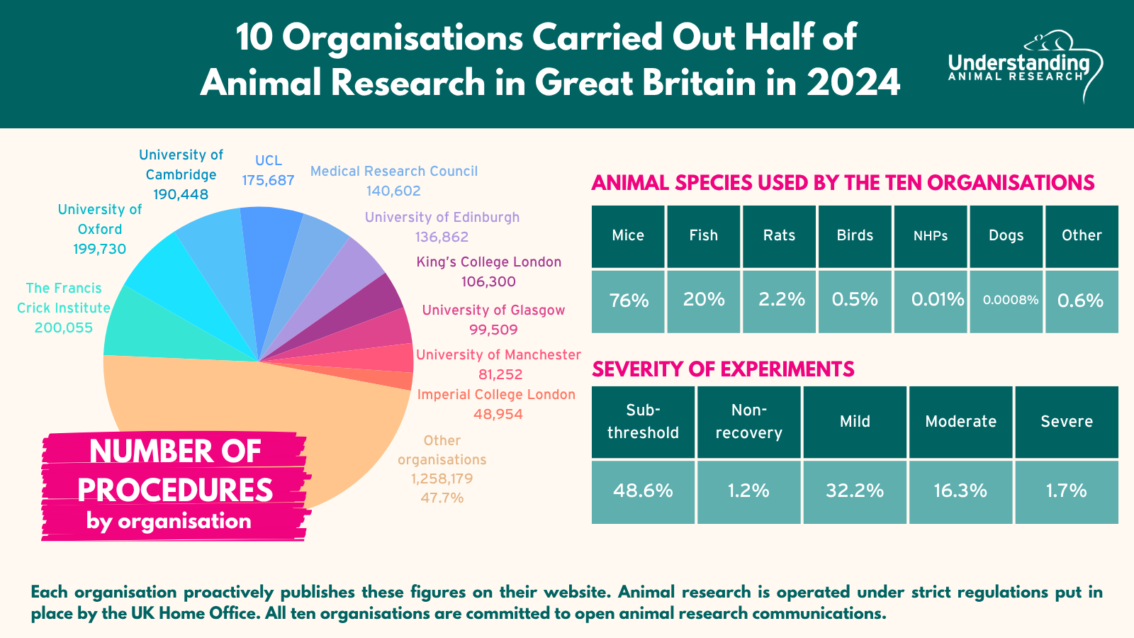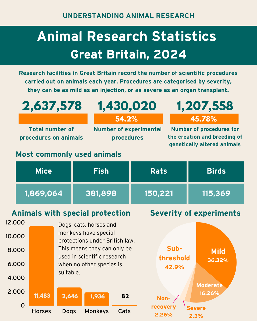 "The 2024 statistics seem much as in previous years. Just under half of procedures are breeding animals with particular genetic qualities, and the rest are more traditional categories, such as medical research. Procedures using mice, fish, rats and birds are the most common by far, making up 95% of the total. Experiments which result in severe suffering continue to be relatively rare at 2.25% of all procedures (3.27% of experimental procedures and 0.92% of breeding procedures).