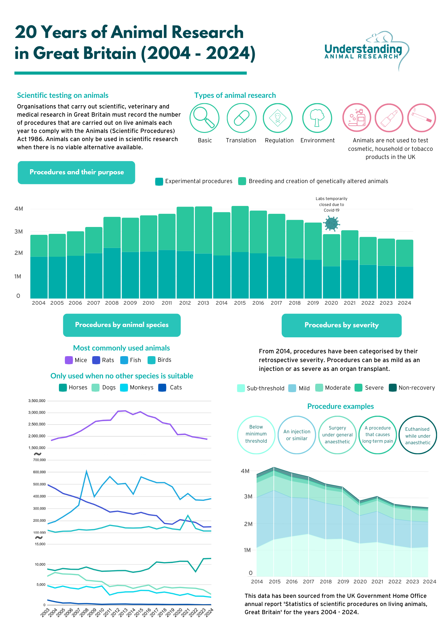 In 2020 the total number of procedures recorded was the lowest they had been since 2004. This was due to various COVID-19 national lockdowns imposing strict limits on daily life and causing many institutions to delay or stop research studies using animals.